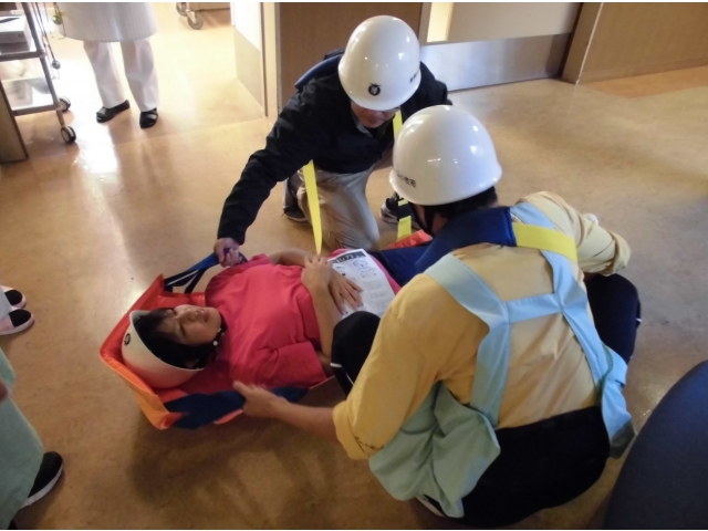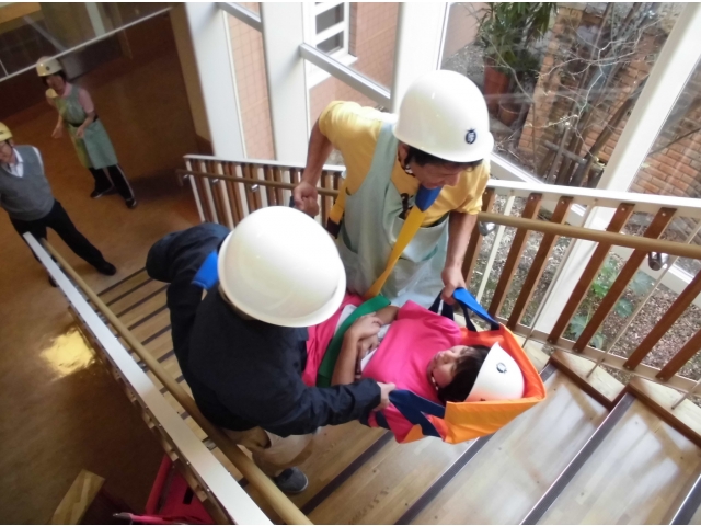 簡易担架は、けが人役が不安にならないよう「階段、あたまから行きます!」など、動作の前に声かけを行いました。