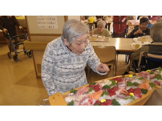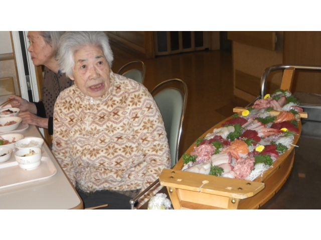 昼食は舟盛りの刺身や茶碗蒸しなど、リクエストの多いメニューを提供しました。「まぐろがいいな!」「甘エビおいしいね。」などいつもよりも、会話が弾んでいたご様子でした。