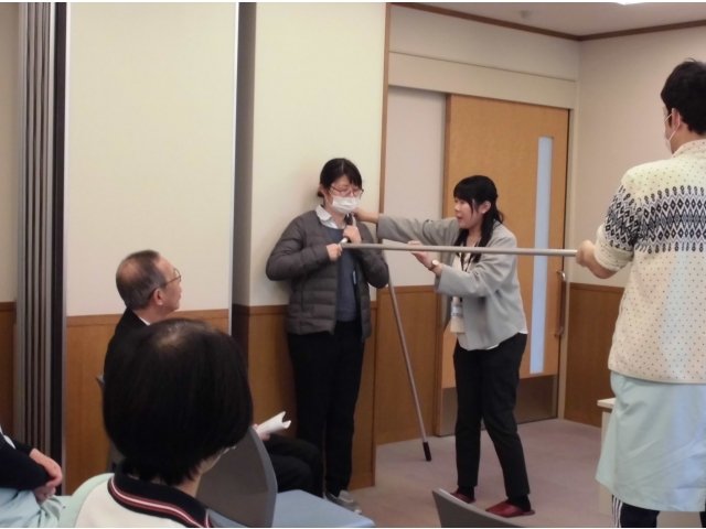 夜間、刃物を持った不審者が押し入り、職員が対応したところ暴れだすという実技訓練の後、講評をしていただきました。
