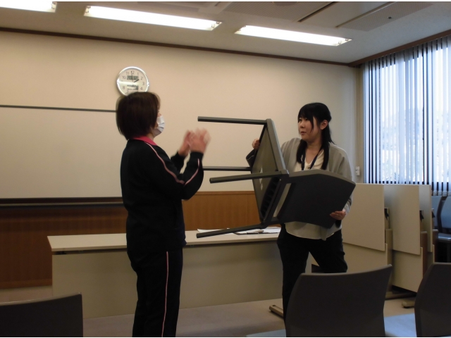 (4)椅子など身近な物を武器として使い、複数人で不審者の対応をする。