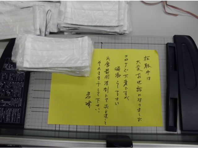 本日、元職員である岩崎様より布マスクの寄贈がありました。全て手作りのマスクで、1枚づつビニール袋に入れて寄贈していただきました。職員に1枚づつ配り、使用させていただきます!ありがとうございました。