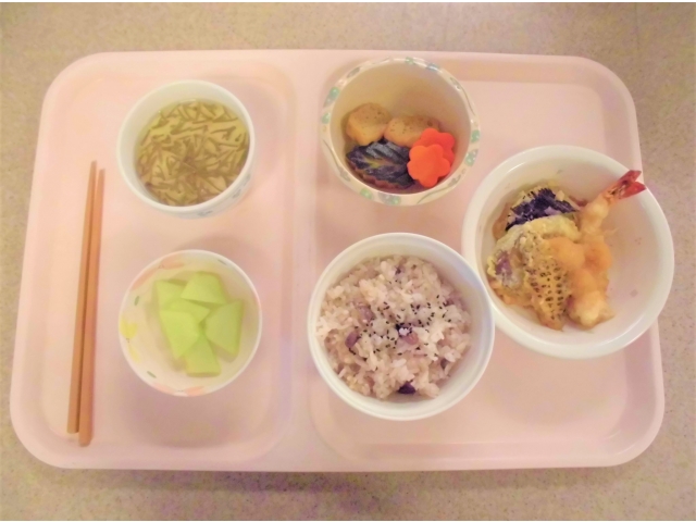 献立は、赤飯、天ぷら、炊き合わせ、じゅんさいの冷製茶碗蒸し、メロンです。