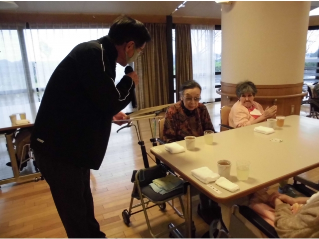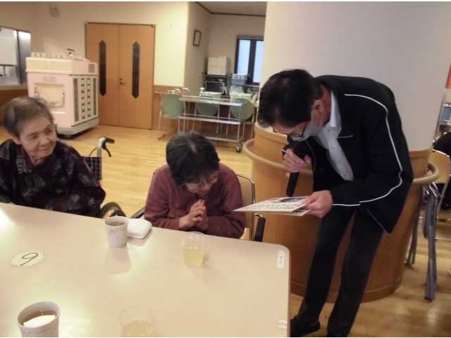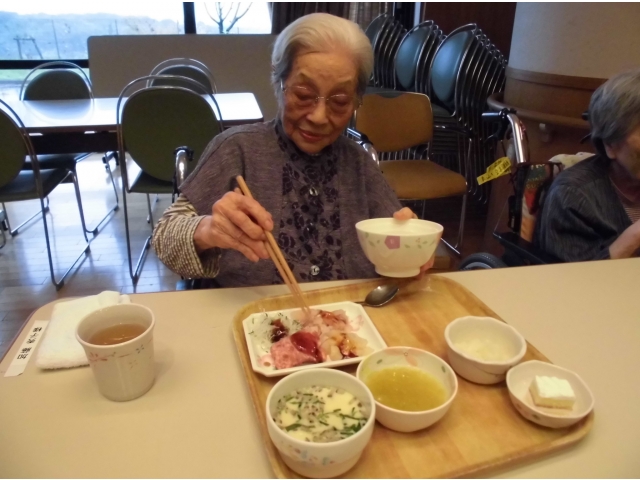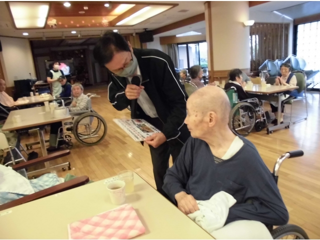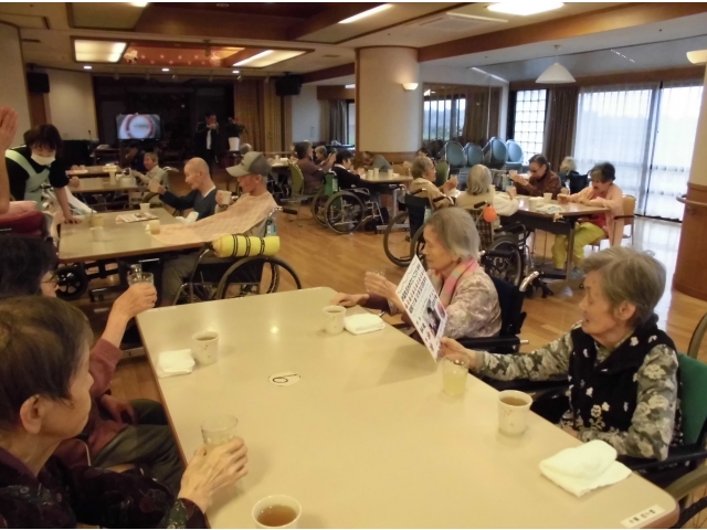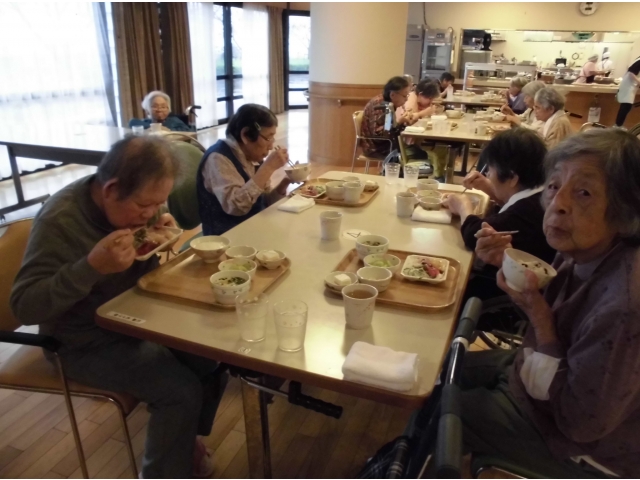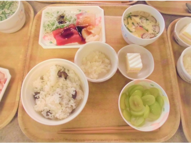 10月9日に、誕生会を行いました。まずは、苑長から誕生月の利用者様に色紙をプレゼントし、その後乾杯!今月の誕生会食は、むかごご飯、刺身盛り合わせ(カンパチ、マグロ、ホタテ)、べったら漬け、茶碗蒸し、シャインマスカット、ケーキでした。いつもより完食されている方が多かったです^^