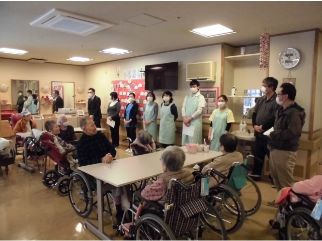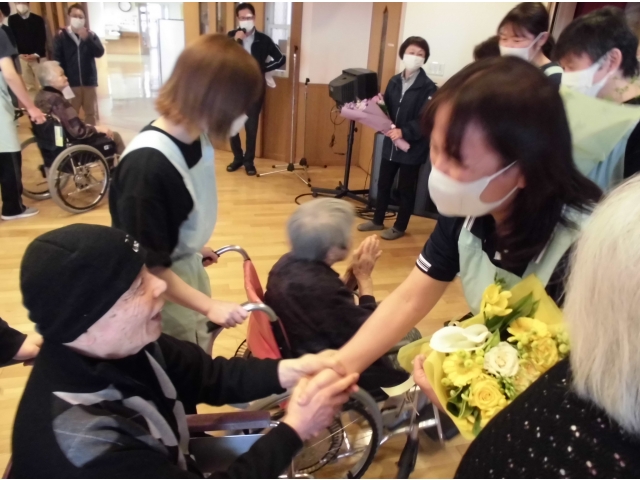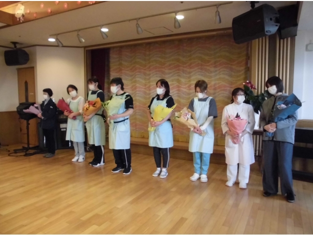 その後、利用者のみなさんや職員から、労いの言葉や次の職場に向けてのエールを込めて、花束の贈呈を行いました。