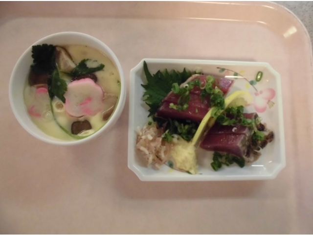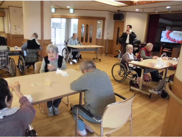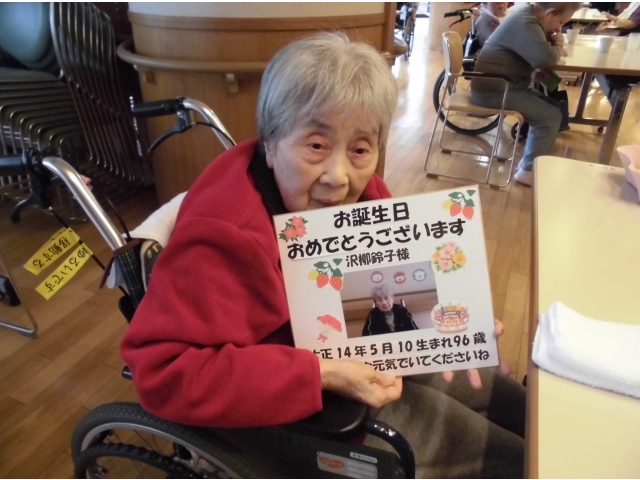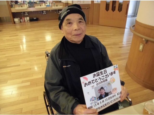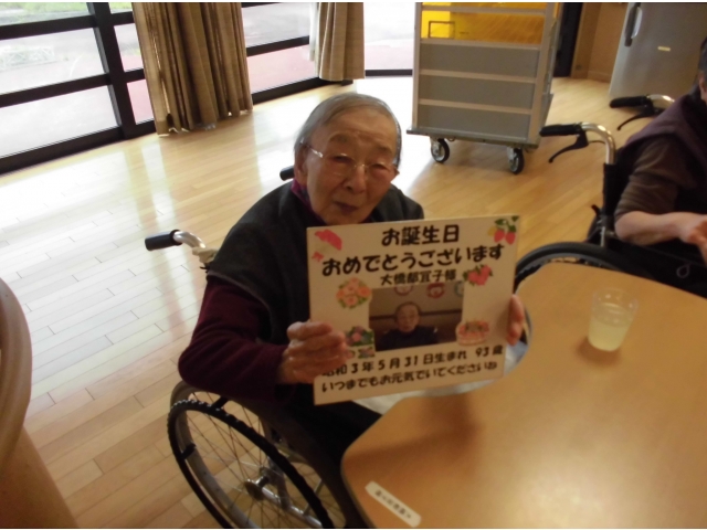 5月7日に、誕生日会を行いました。まずは、苑長から誕生月の利用者様に色紙をプレゼントし、その後乾杯!今月の誕生日会食は、今が旬のかつおのたたきをメインに、菜飯、らうす昆布白菜、茶碗蒸し、メロン、レアチーズケーキです。「いつも美味しいけど、今日は一段と美味しかった」と利用者さんにとても喜ばれました。
