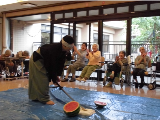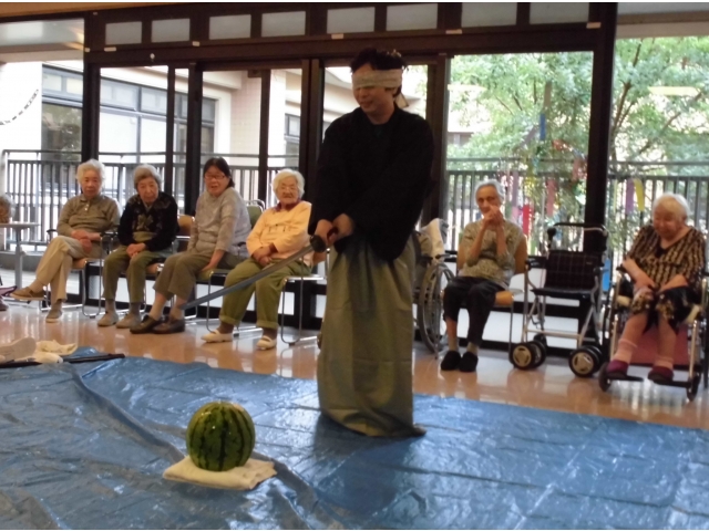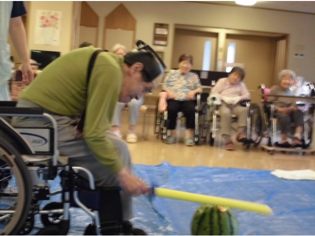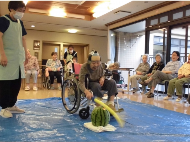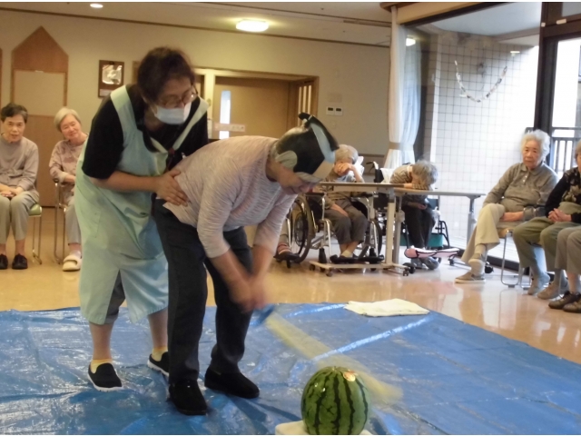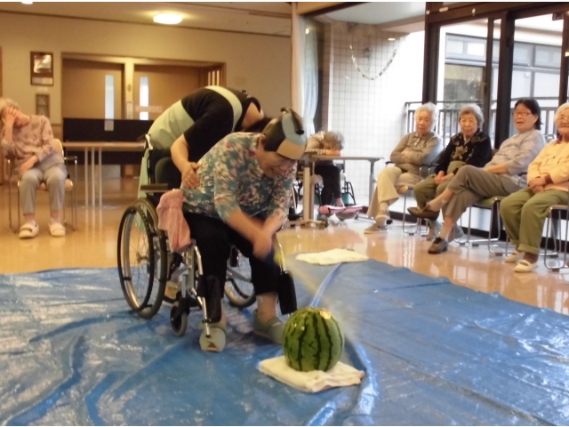 デイルームの真ん中に、大きなスイカを置き、それを取り囲むように利用者様が座って、「せーの、よいしょ」の掛け声で、順番にスイカ割りを行いました。