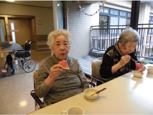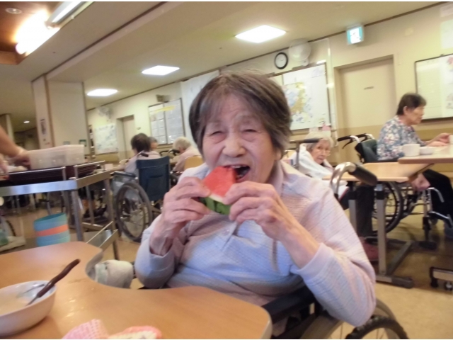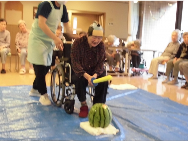 普段は下を向いていることが多い利用者様が、顔を上げて、棒でスイカを叩いていたり、その様子を声を上げて笑っていたり、とても盛り上がっていました。
