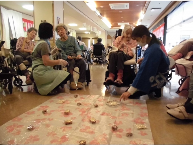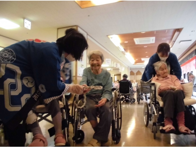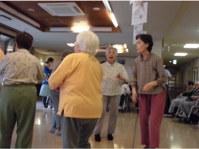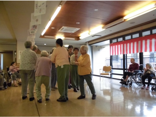 何曲か踊っている合間に、輪投げを行いました。好きなお菓子を狙った目は皆さん真剣そのもの。ゲットしたお菓子を手にすると表情が一変、ニコニコ笑顔になりました♪