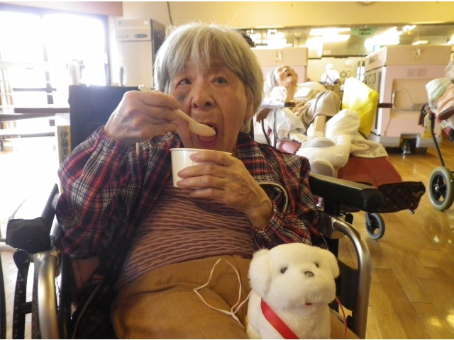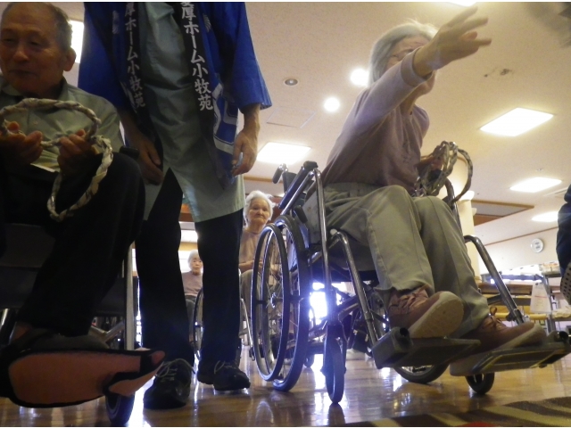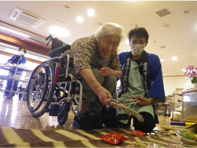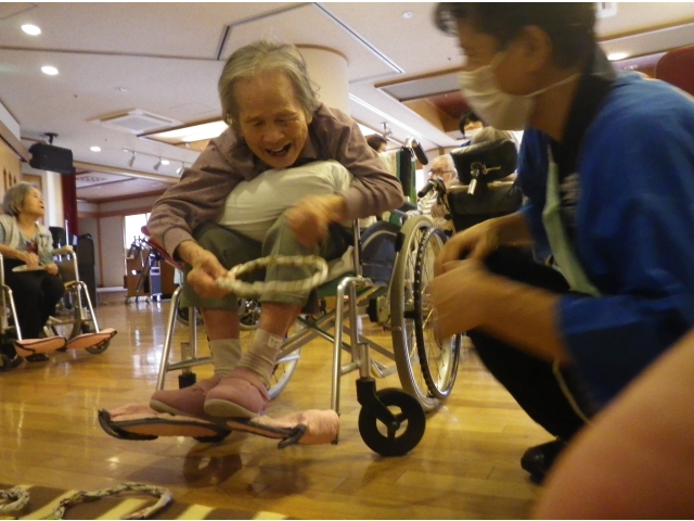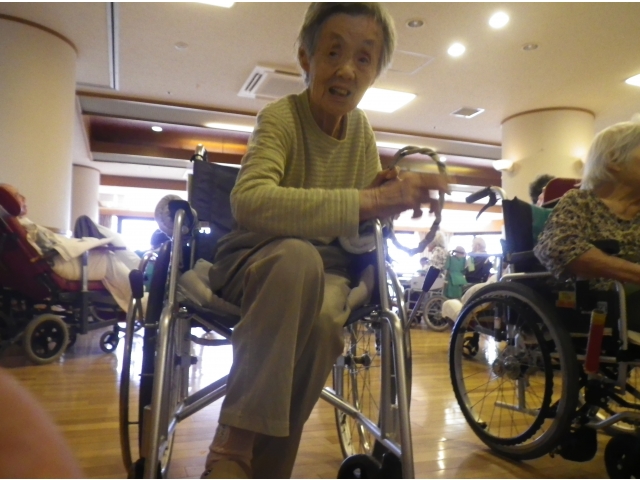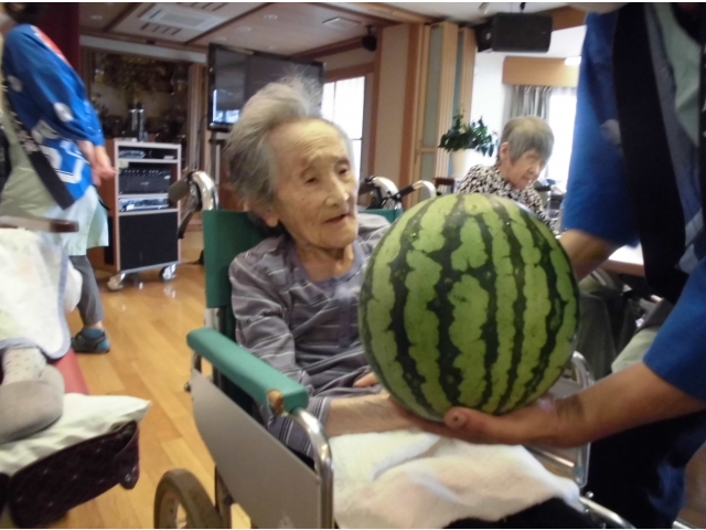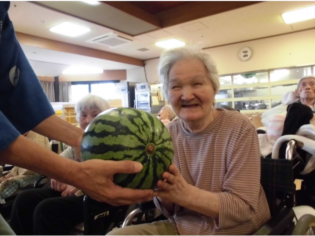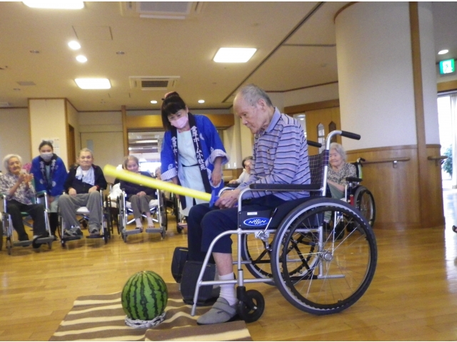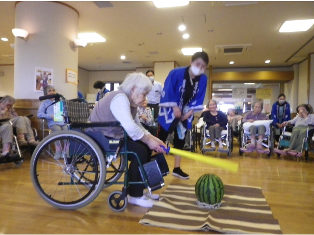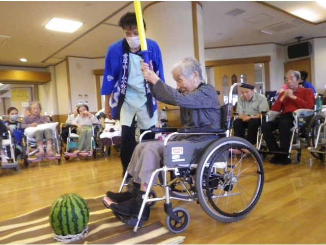スイカ割では、皆さんが参加し、思いっきり楽しむことができました。いつもは穏やかな方が、前のめりになって楽しんだり、麻痺があって動きにくい方の手を一生懸命動かして割ろうとしたり、楽しみながらも何とか割ろうと皆さん必死になっていました。