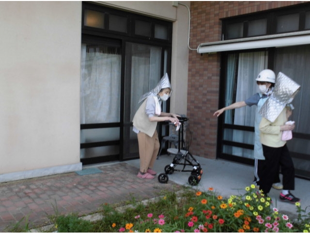 今年度は、非常用滑り台も職員が体験しつつ、苑全体で防災訓練を実施しました。