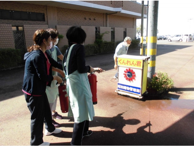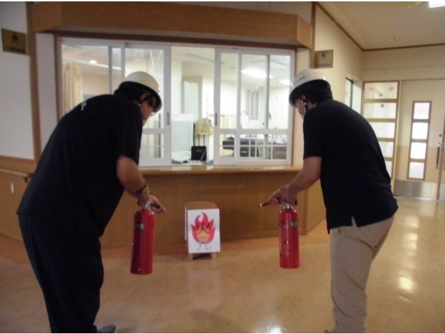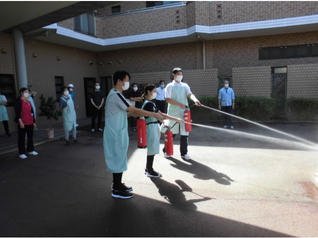 最後に職員が水消火器を使用して消火訓練を実施し、消火器の取り扱いを体験しました。