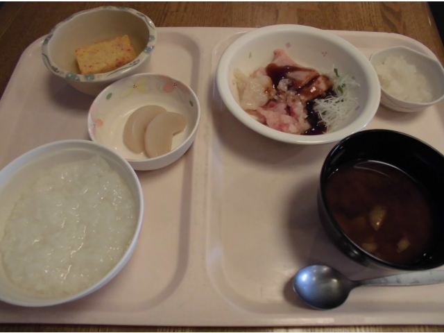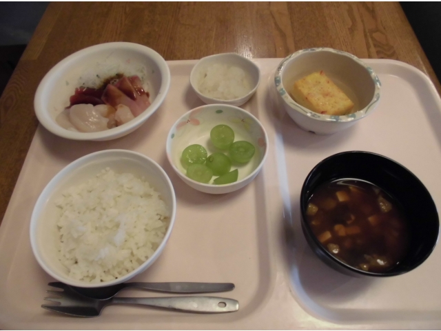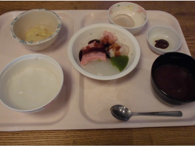 今月の誕生会食は、お刺身(かんぱち、まぐろ、ホタテ)盛り合わせ、カニと錦糸卵のやわらかしんじょう、べったら漬け、味噌汁、シャインマスカットでした。
