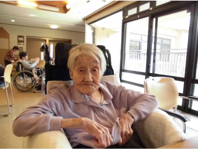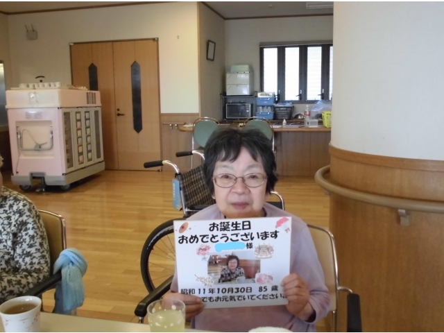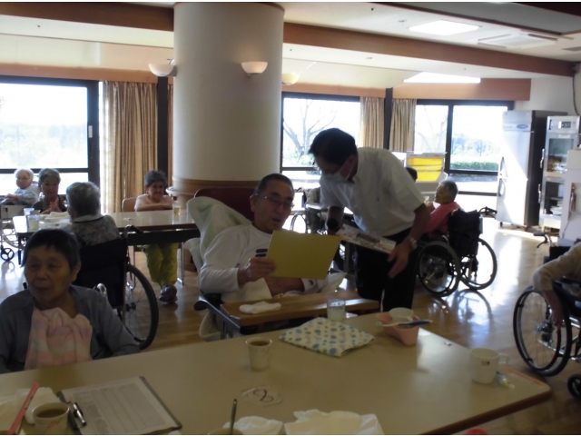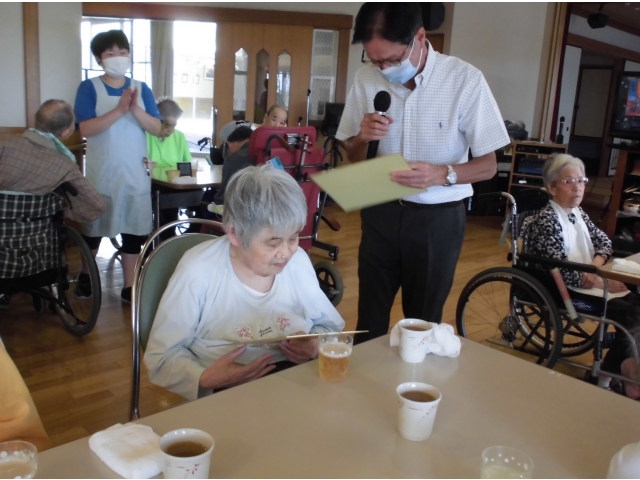 ハッピーバースデイの歌を歌った後、苑長と乾杯!誕生月の利用者さんへ色紙をプレゼントしました。