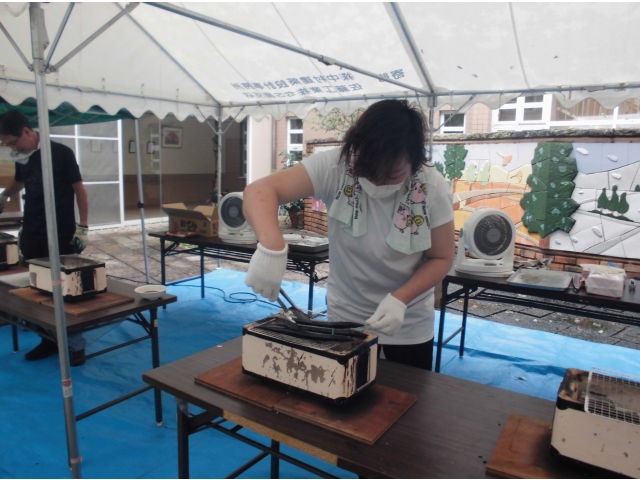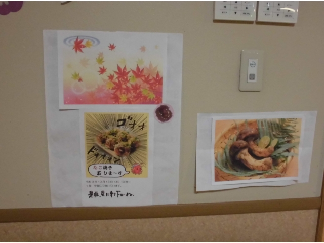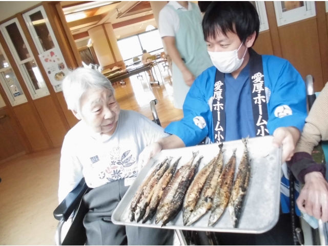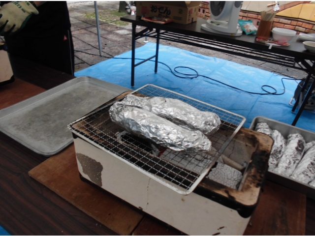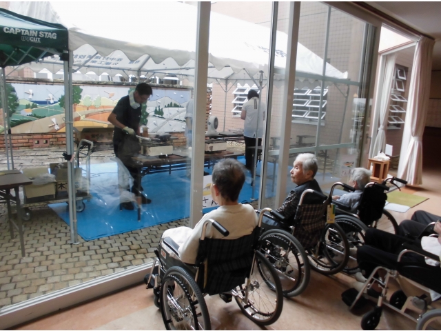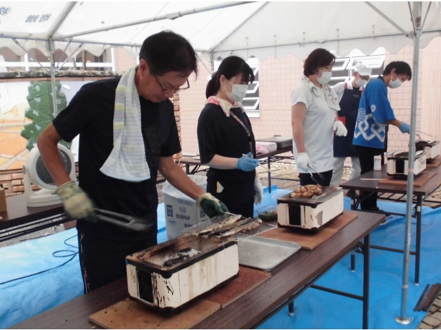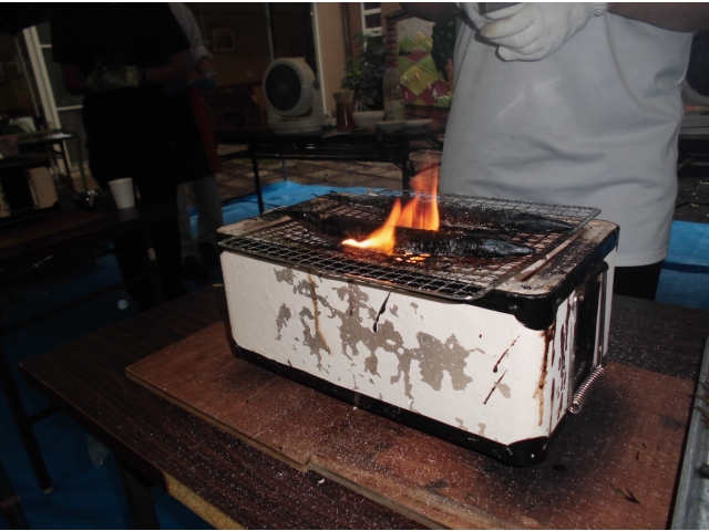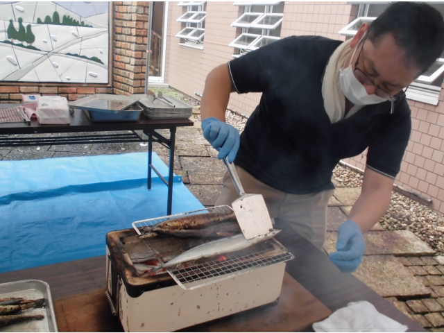 午前の部では、七輪で秋刀魚・松茸・焼き芋を焼き、たこ焼き、わたがしなど利用者の前で作りました。