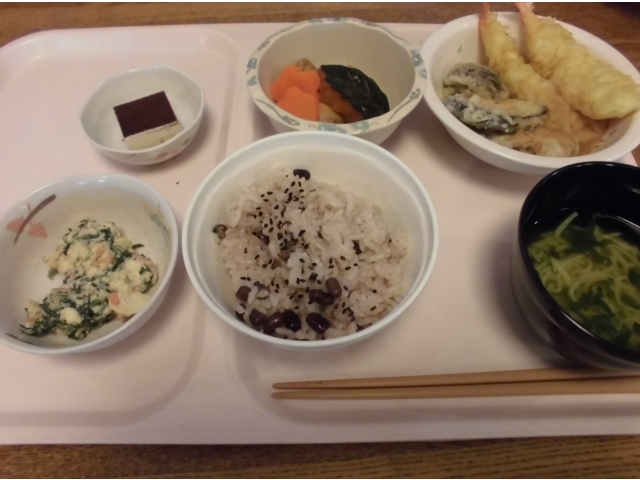 本日の献立は、赤飯、天ぷらの盛り合わせ(エビ、椎茸、さつま芋、茄子)、炊き合わせ(木の葉南瓜、がんも、梅花人参)、春菊の白和え、錦糸卵のすまし汁、ティラミスケーキです。