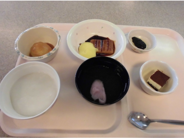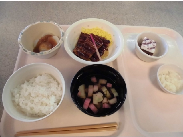 本日のメニューは、鰻の蒲焼き、里芋のゆずみそかけ、べったら漬け、すまし汁、ケーキ(ブルーベリーケーキorティラミスケーキ)でした。