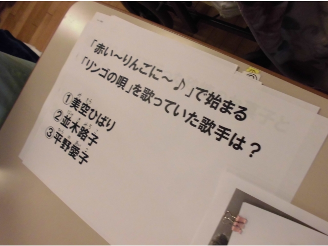 1丁目は、回想法(昭和時代に関する3択問題)を行い、昔のことを思い出したり、懐かしんでいただきました。「なつかしい」や「チキンラーメンは昔は高価だった」「チキンラーメンのタマゴポッケはいつからあるのだろう?」「私は大正生まれだから昭和のことはわからないわ」などなど、皆さん昭和を懐かしみ、話に花が咲きました。