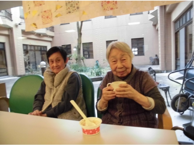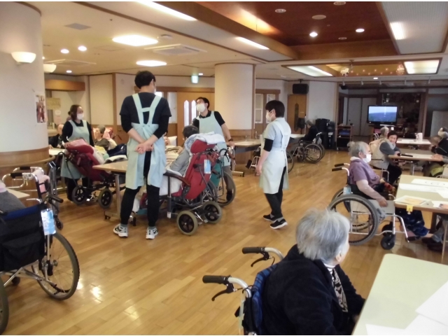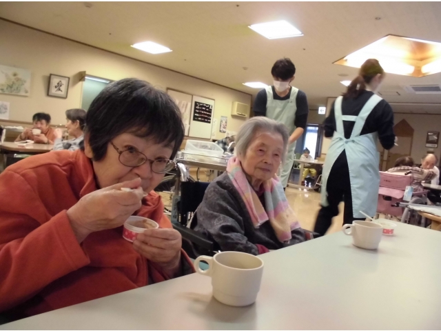 その後は、お待ちかねのおやつタイムです。煎茶と和菓子風ムース(ふんわりきなこ)を提供しました。嚥下に配慮されたムースだったので、皆が同じものを食べることができました。とても美味しかったようで、皆さんペロリと完食されていました。