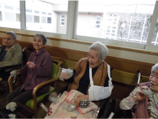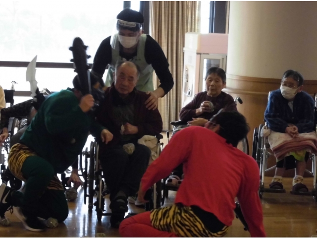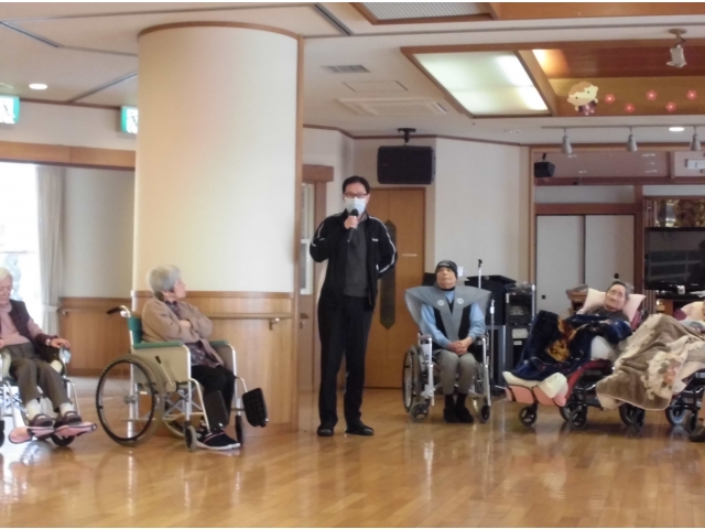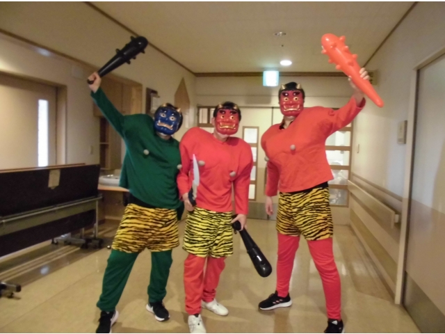 苑長の挨拶、年男・年女の紹介をし、いよいよ鬼の登場。