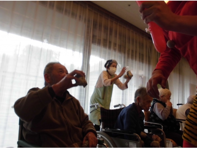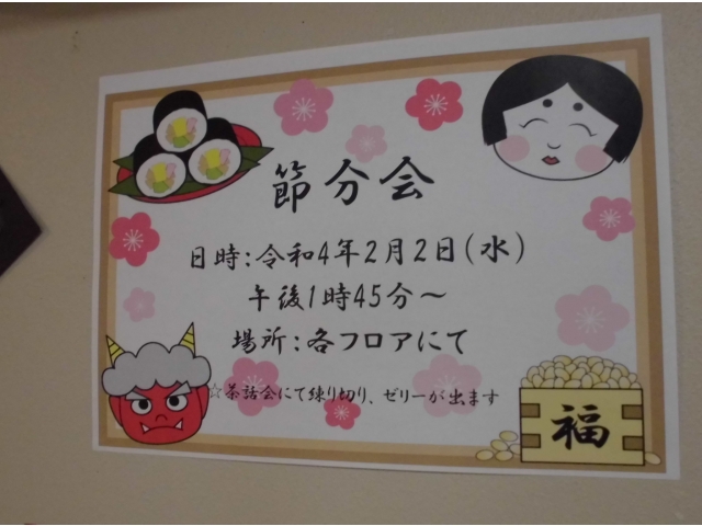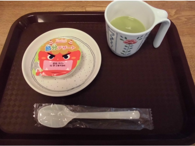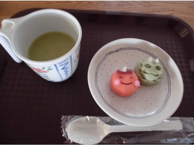 鬼を退治しホットひと息。抹茶オレと鬼のねりきりor節分ゼリーを召し上がって頂きました。