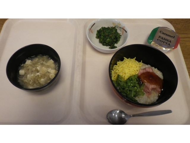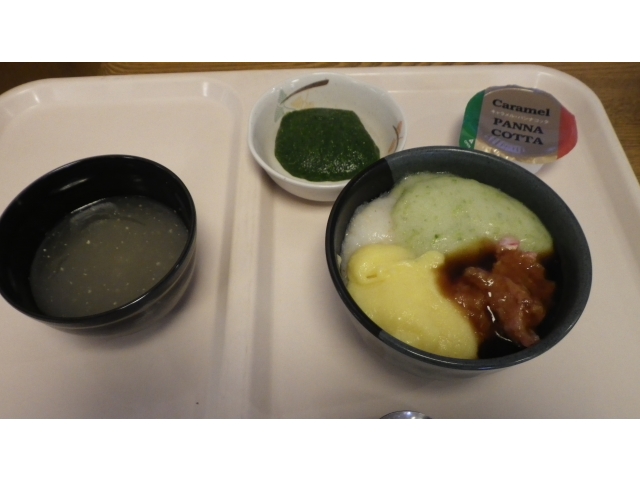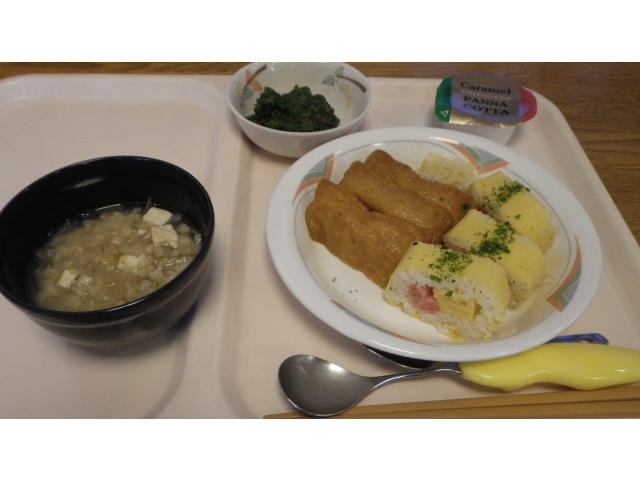 昼食は、錦糸卵の太巻き、いなり寿司、菜の花のごま和え、けんちん汁、キャラメルパンナコッタです。