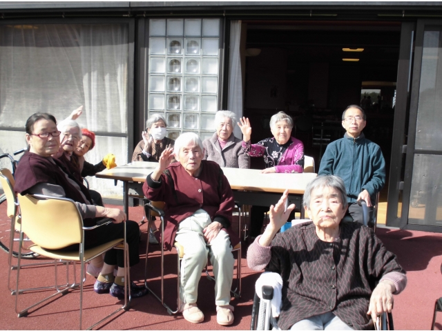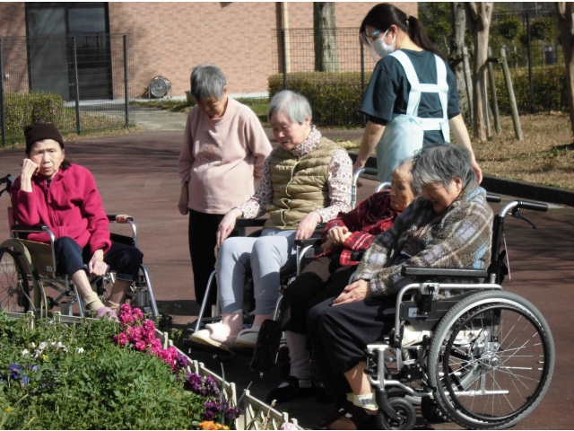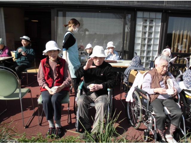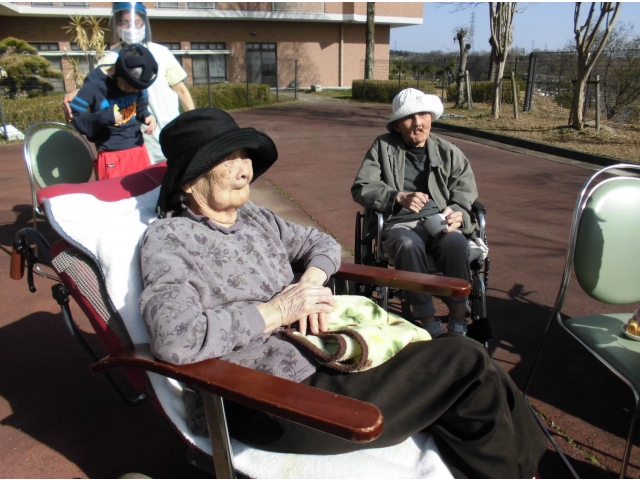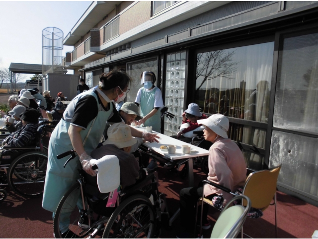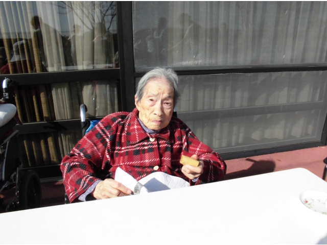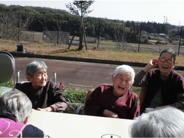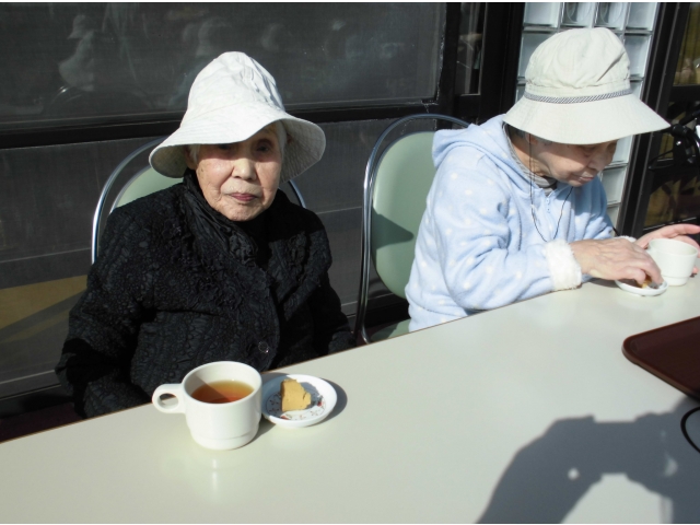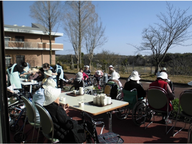 3月16日、3丁目では中庭で茶話会を行いました。外にでた瞬間、「わぁ~風が気持ち良い!」と歓声が上がりました。花を見ながら黒糖ケーキとお好みでコーヒーか紅茶を選んで頂きました!(^^)!