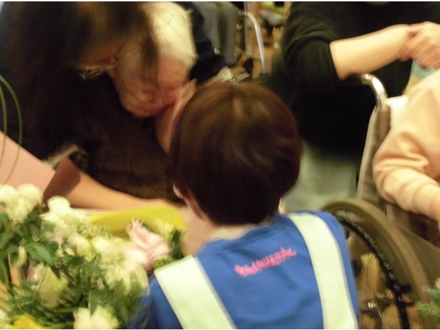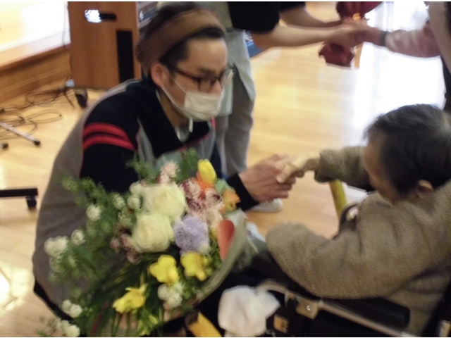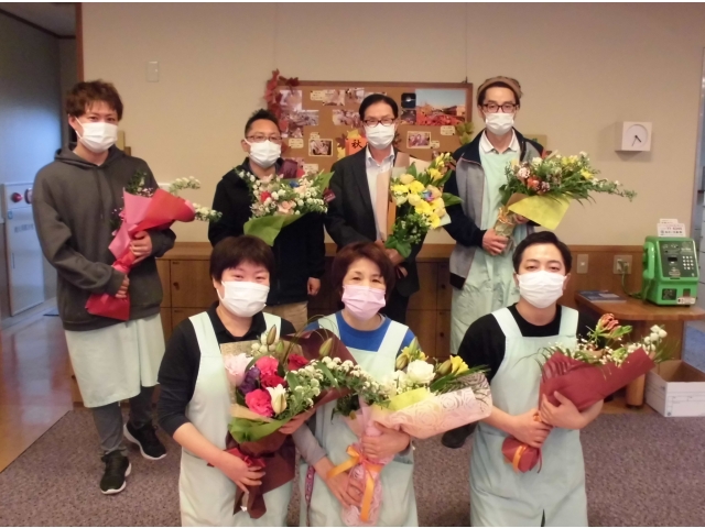 利用者の皆さんから、「頑張れー!」「ありがとう!」など労いの言葉が飛び交い、次の職場に向けてのエールをこめて花束の贈呈がありました。