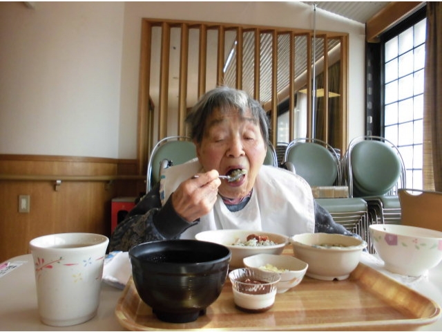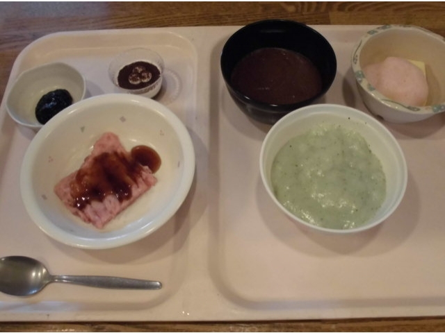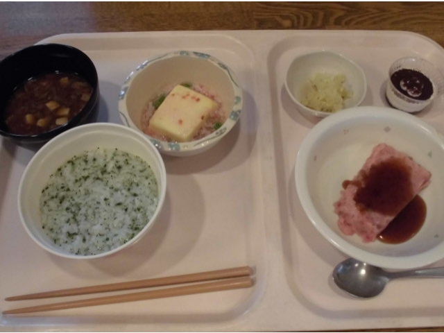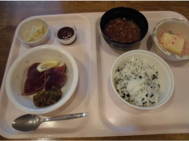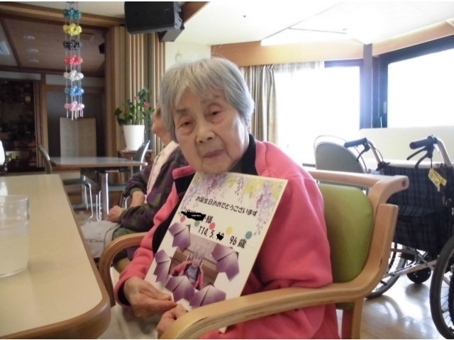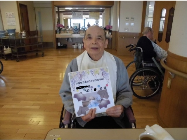 5月6日、誕生会を行いました。まずは、苑長から誕生月の利用者様に色紙をプレゼントし、その後乾杯しました。今月の誕生会食は、今が旬のかつおのたたきをメインに、わかめご飯、らうす昆布の白菜漬け、たまご豆腐のかに風味あんかけ、豚汁、ティラミスカップケーキです。
