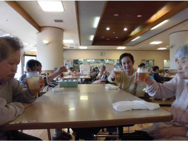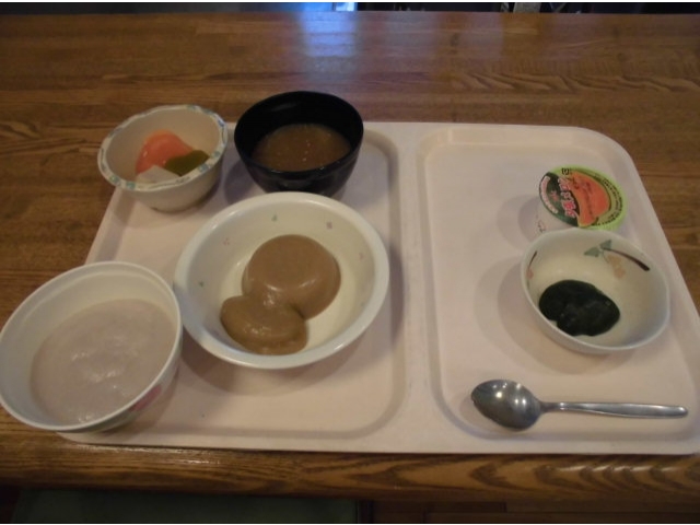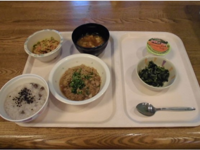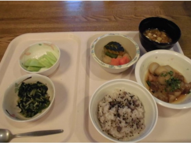 6月3日、誕生会を行いました。今月の誕生会食は、赤飯、豚肉の角煮、がんもと木の葉南瓜の煮物、ほうれん草のナムル、味噌汁、メロンでした。今季初のメロンに皆さん「甘くて美味しい!」「完熟ですね」など大変喜ばれていました。