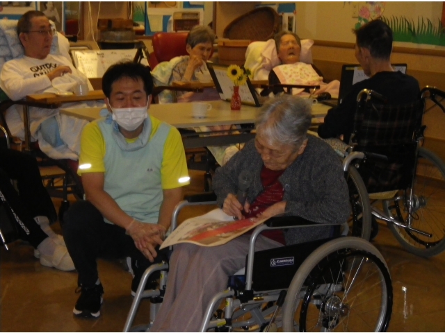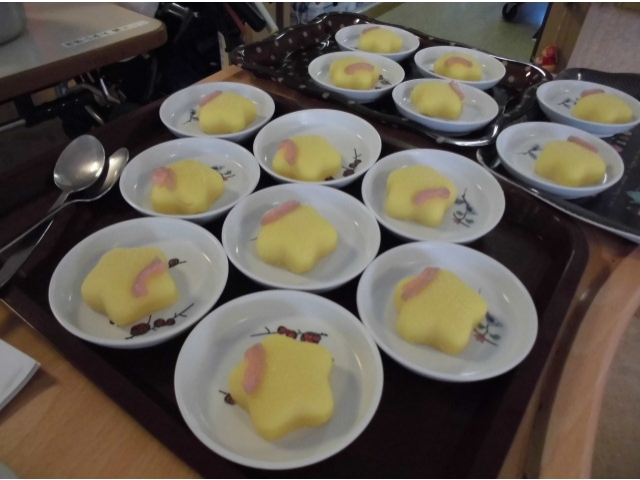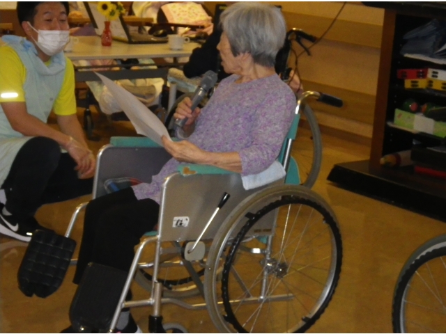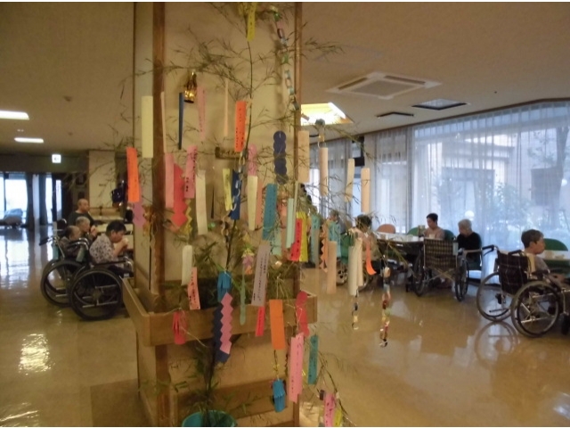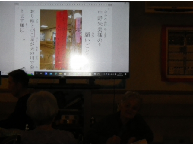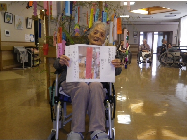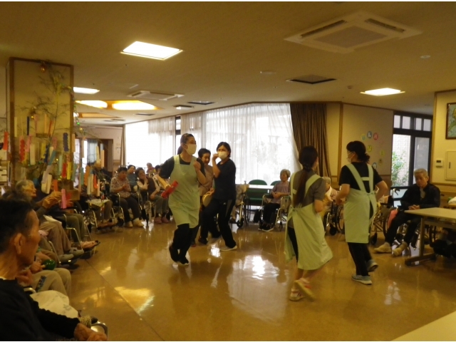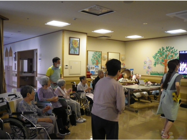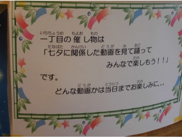 1丁目は、願い事の書かれた短冊を読み上げ、七夕にちなんだ映像を視聴しました。その後、七夕祭りや盆踊り大会などでよく使用される、荻野目洋子さんの『ダンシングヒーロー』に合わせて皆で楽しく踊りました。