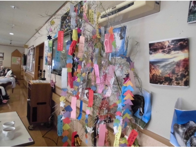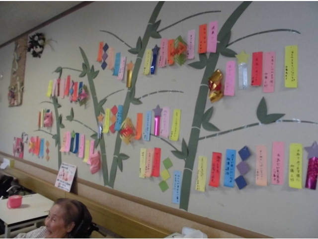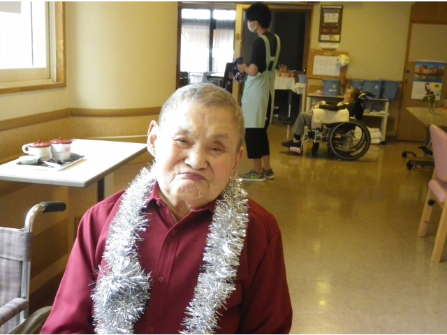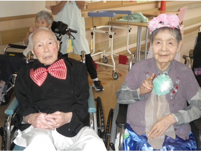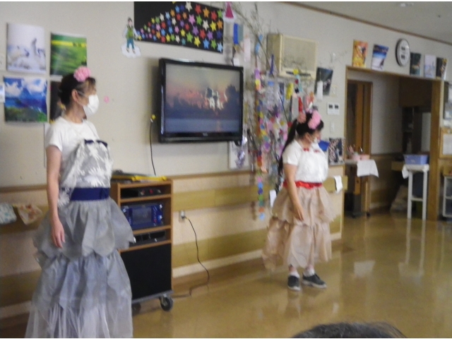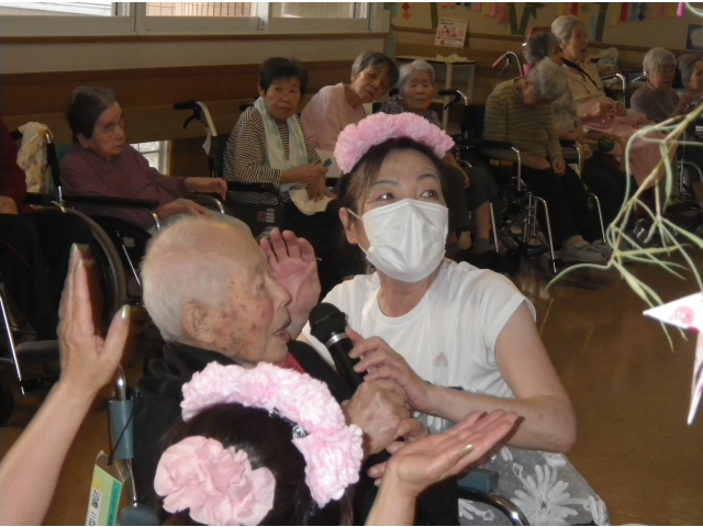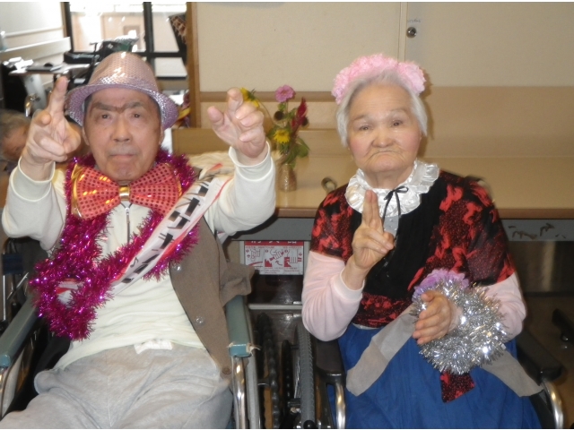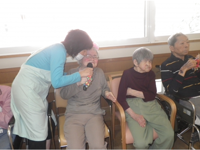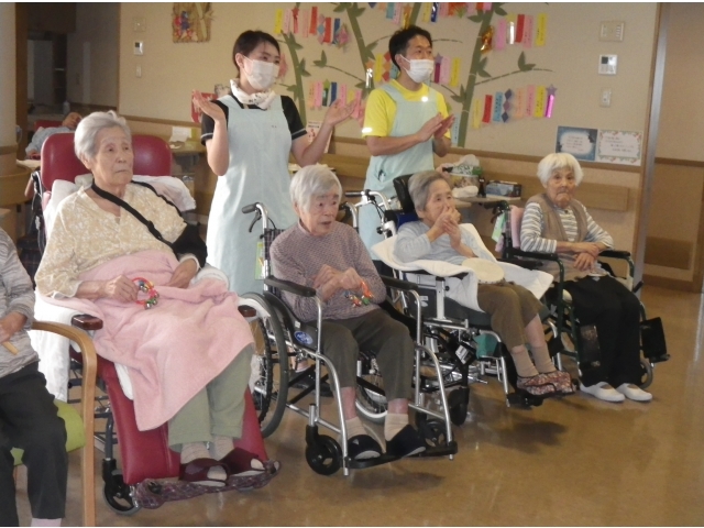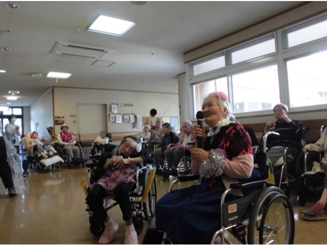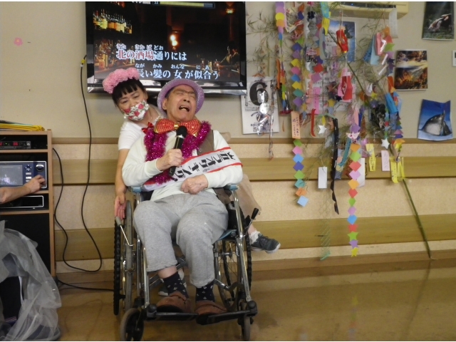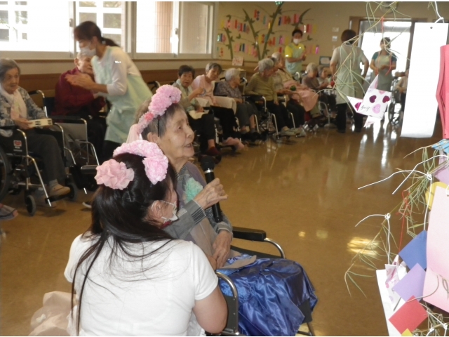 2丁目は1番地と2番地合同でカラオケ大会を行いました。星形の練り切りや抹茶水ようかんを食べた後は、お待ちかねのカラオケ大会です。きれいにお化粧や仮装し楽しんでいただきました。皆の前では恥ずかしいと歌わない方も一緒に歌ったり、タンバリンやカスタネットで音楽に合わせたりと大盛り上がりでした。