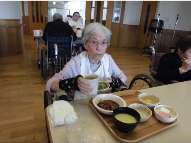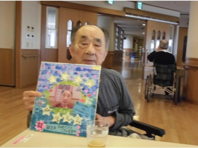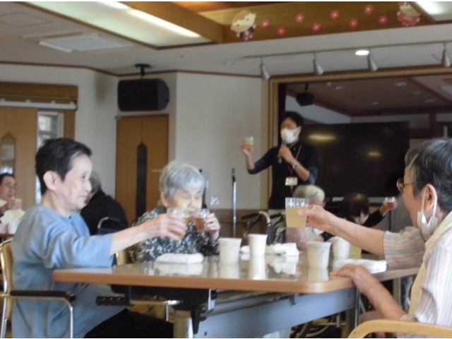 相談員のあいさつのあと、誕生月の利用者様へ色紙のプレゼントをし、ノンアルコールビールやりんごジュースで乾杯を行いました。