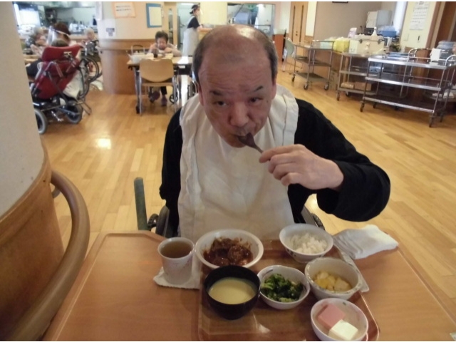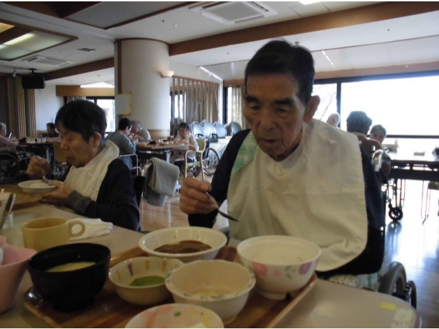 今月の誕生会食は、ご飯、ミートローフ、錦糸卵のエビ真丈、ブロッコリーのピーナツ和え、コーンスープ、紅白レアチーズケーキでした。