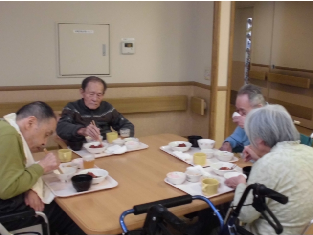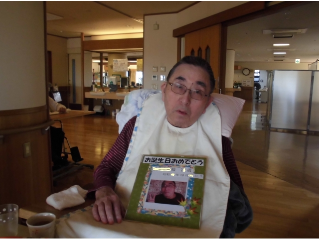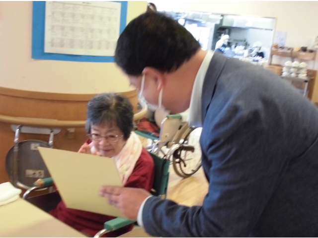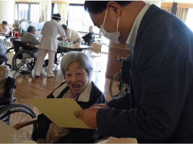 苑長から挨拶のあと、誕生月の方へ色紙をプレゼントし、ノンアルコールビールやりんごジュースで乾杯を行いました。