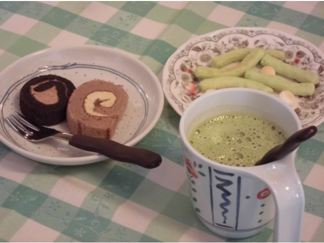- 一例;ロールケーキ(栗&チョコ)、抹茶オレ