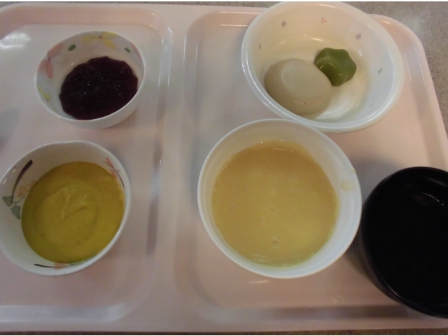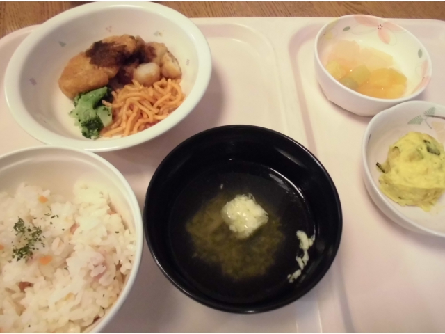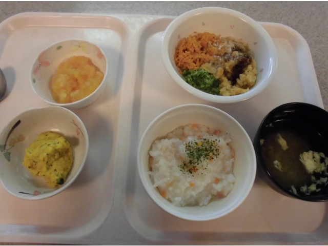 10月31日、少し華やかな献立でした。 🎃ハロウィンメニュー🎃 キャロットピラフ(粥;キャロットリゾット) エビフライ・コロッケ盛り合わせ 付け合わせ)ブロッコリー、ナポリタン パンプキンサラダ ミックスフルーツ(ミキサー;ブドウゼリー) 卵としめじのコンソメスープ