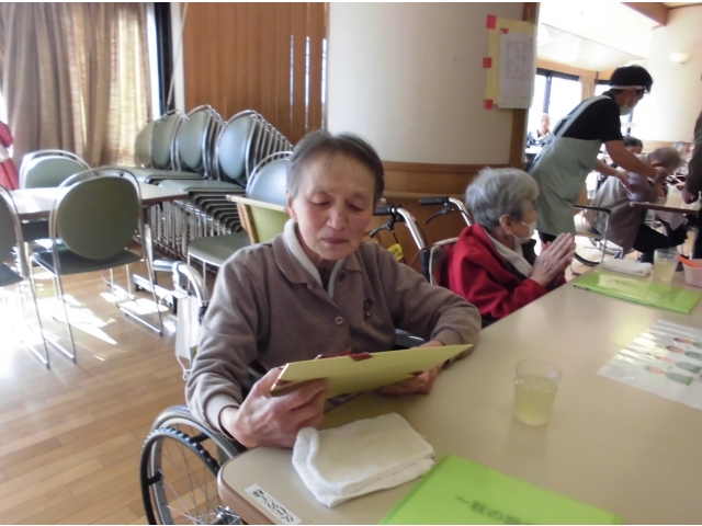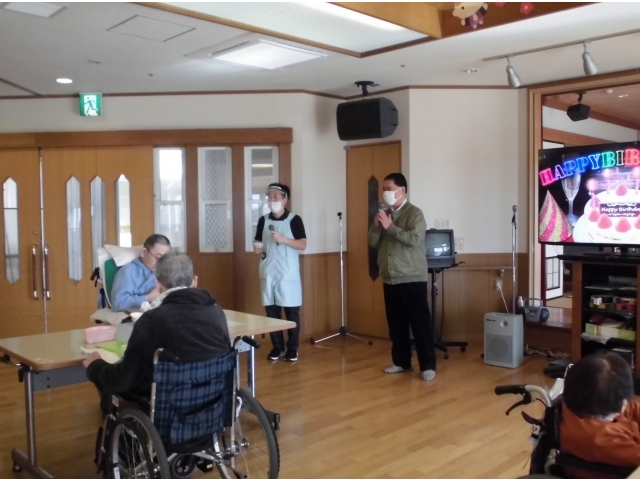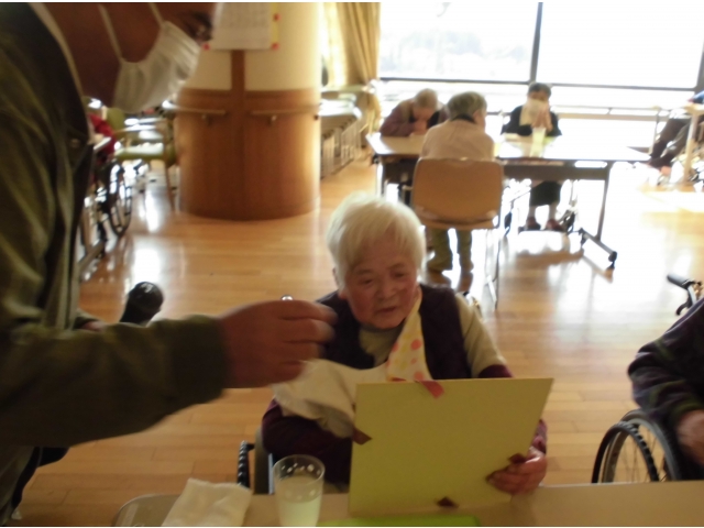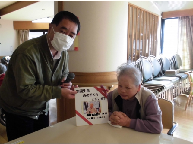 お好みの飲み物で乾杯した後、苑長から誕生月の利用者様へ心のこもった色紙をプレゼントしました。本日誕生日の利用者様もみえて、みんなで歌を歌うと涙を流して大変喜ばれていました。