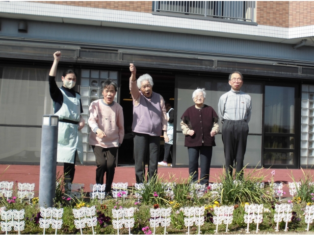 一分咲きの桜や花壇の花を見て「わー、咲いてる」や「お日様に感謝」など皆さん笑顔たっぷりでした!(^^)!
