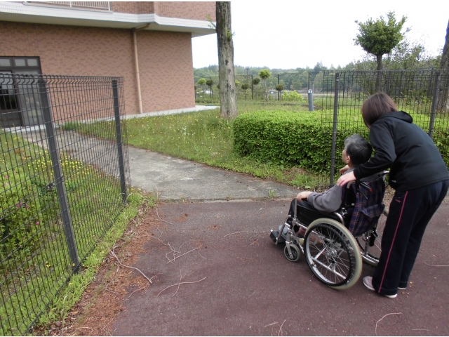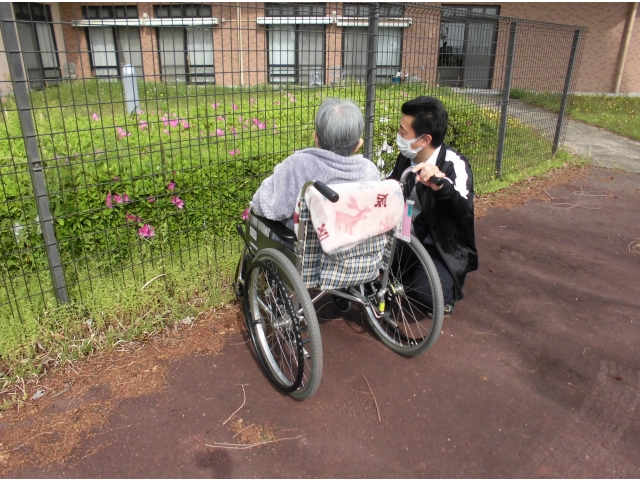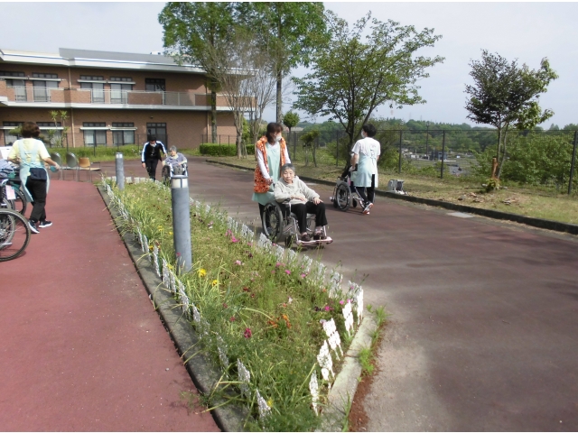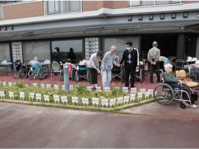 お汁粉を食べた後は、春の陽や風を感じながら景色や花壇の花を見ながら散歩を楽しみました。