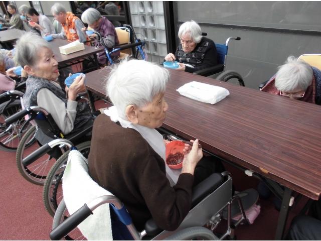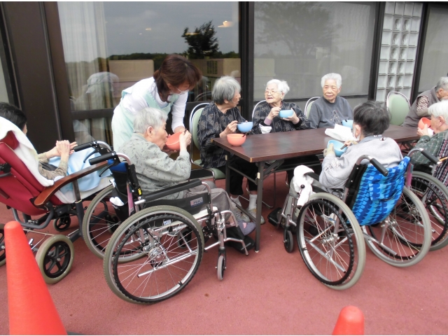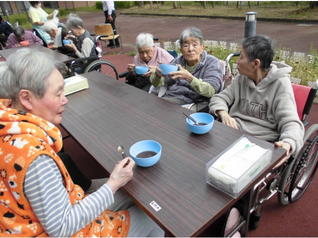 苑庭に机を並べてさつま芋入りのお汁粉を楽しみました。