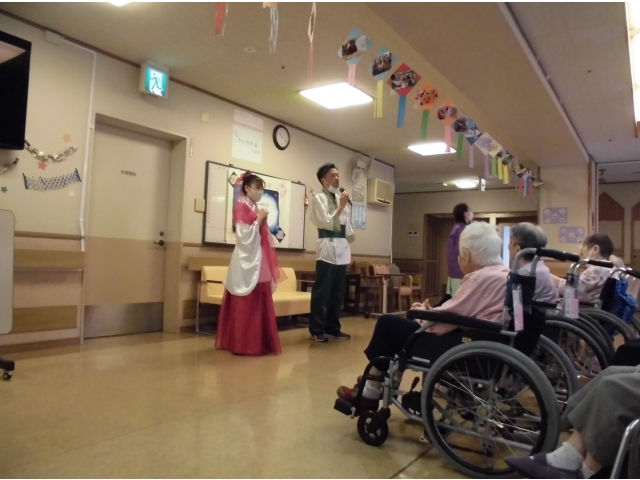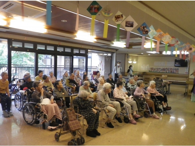 3丁目にも織姫と彦星がやってきました。 短冊の発表をした後、たなばたさまを歌いました。