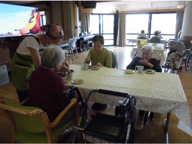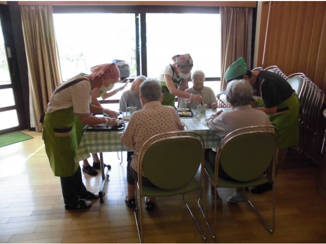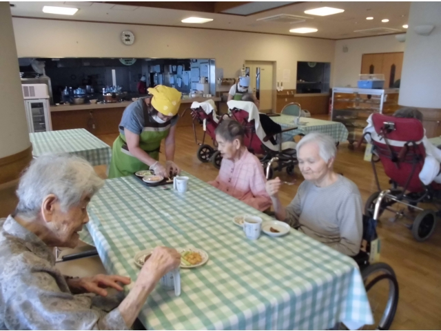 7月26日、ボランティアあかり様の協力のもと、喫茶あかりを開店しました。 今回は、2丁目2番地と3丁目の利用者様51名を対象に行いました。 「気分上々です」「美味しい」など大変喜ばれました。