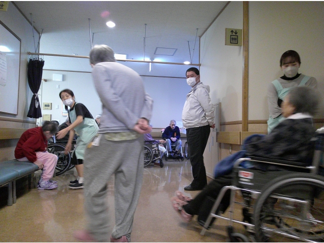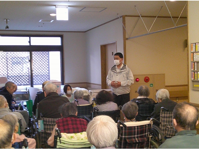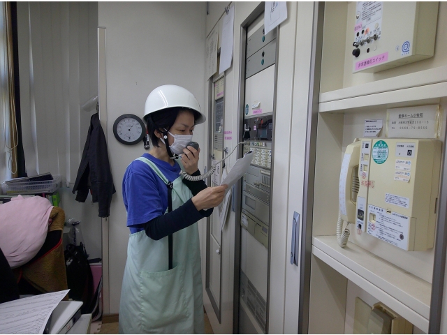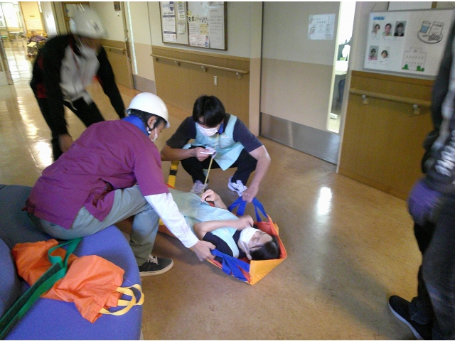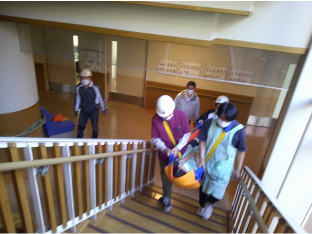 11月2日、非常に激しい豪雨により、北側の山が崩れ、大量の土砂が1階に流れ込んでくる恐れがあることを想定し、1階から2階へ避難する訓練(風水害訓練)を行いました。 また、停電によりエレベーターが使用できないことも想定し、簡易担架を使って2階へ上がる訓練も行いました。 最近では異常気象が頻発しています。普段から訓練を積み重ねていきます。