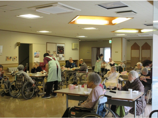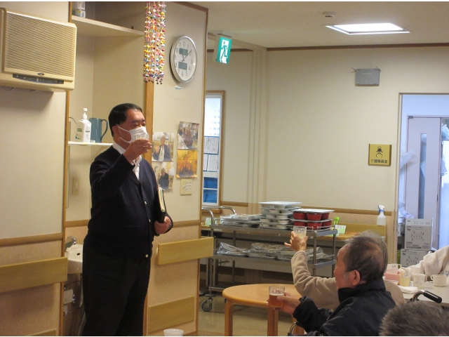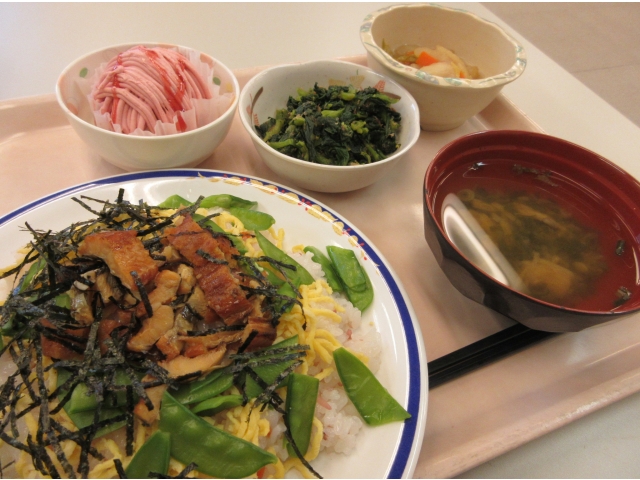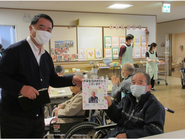 4月5日、誕生会を行いました。誕生月の方へ苑長から心のこもった色紙をプレゼントし乾杯を行いました。 🌸4月誕生会メニュー🌸さくら穴子寿司、白菜の煮浸し、菜の花おかか和え、お吸い物、苺のモンブラン お寿司には桜の塩漬け、国産穴子を使用しています。全体的にとても春らしい献立でした。