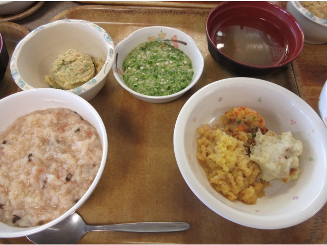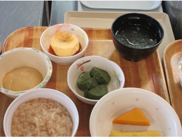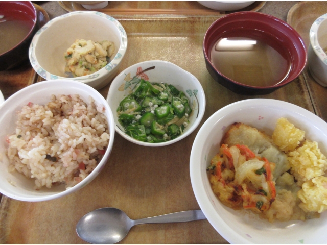 今月の誕生会食は、梅ご飯、天ぷら盛り合わせ(えび、白身魚、野菜のかき揚げ)、北海道大豆の五目おから、オクラのなめ茸和え、お吸い物、誕生日ケーキ(ショートケーキ)でした。