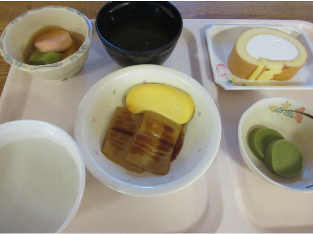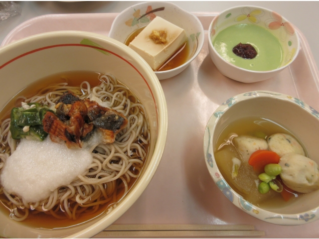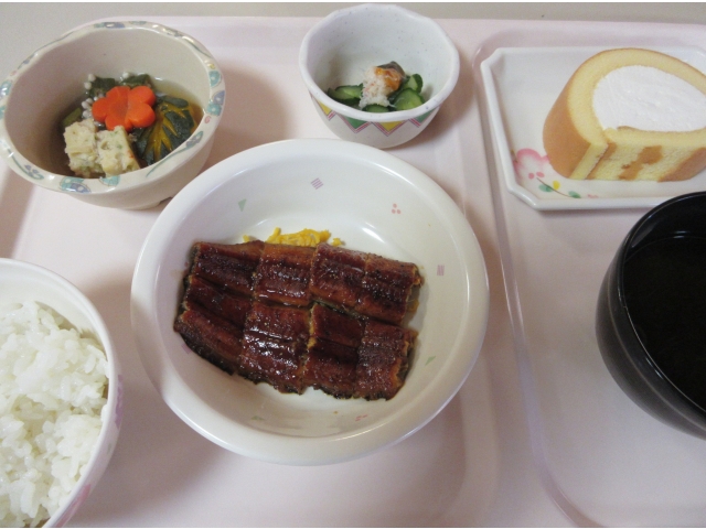 「ごちそうですね。」「ウナギがふっくらしていて美味しいです。」「ケーキも嬉しい」