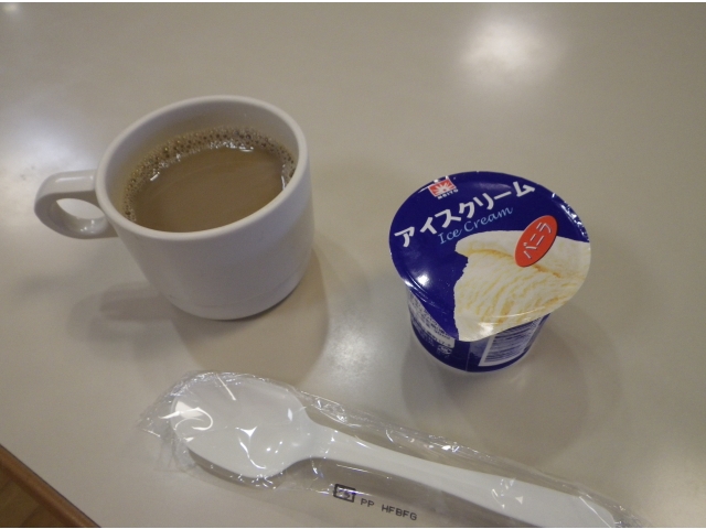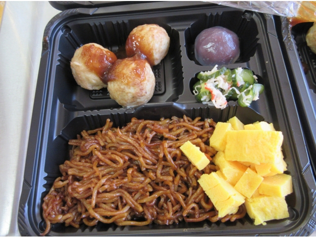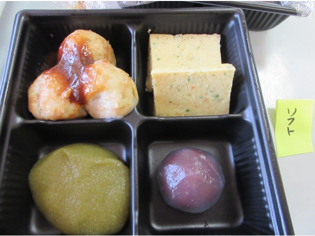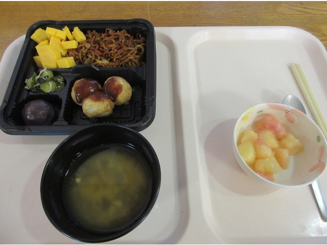 盆踊りの後は、お楽しみの昼食です。 屋台飯をイメージし弁当箱で提供しました。3時のおやつはアイスクリームです。 皆さん美味しそうに召し上がっていました。