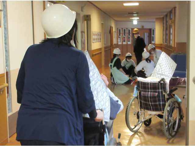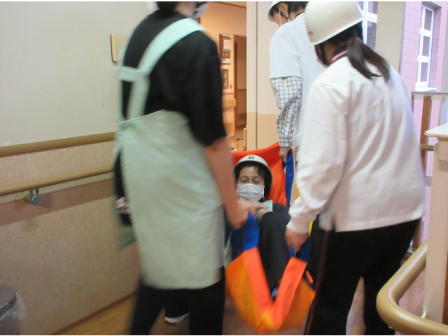 また停電でエレベーターが使用できないことを想定して、簡易担架を用い、階段での避難手順も再確認しました。