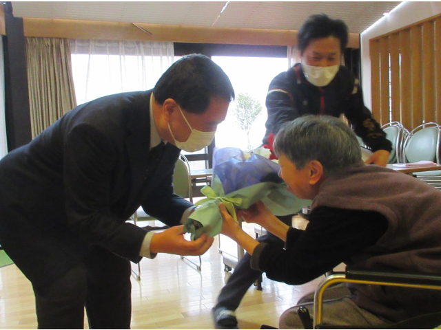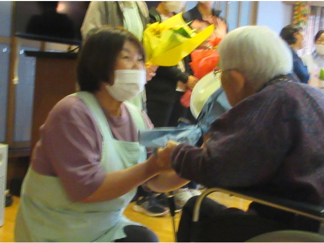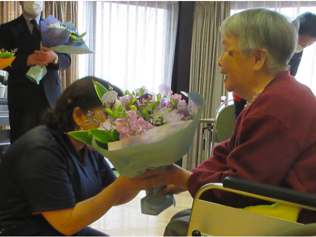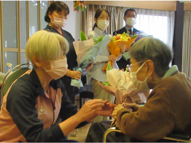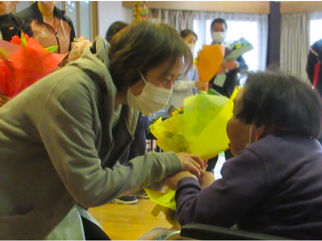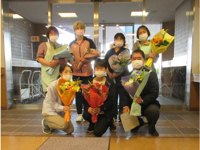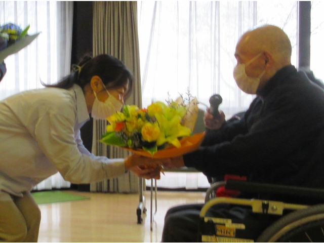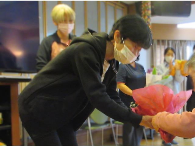 また職員の方々へ、利用者のみなさんからそれぞれ花束をお渡ししました。💐