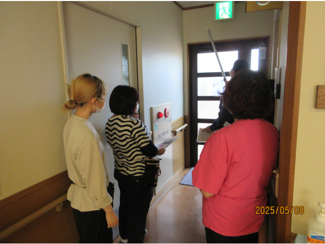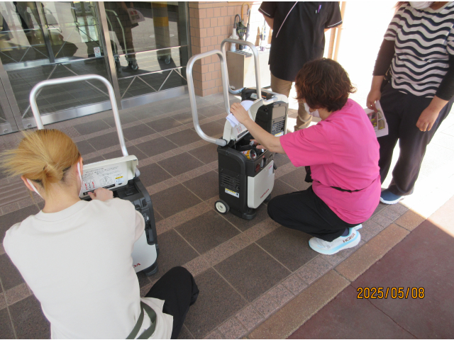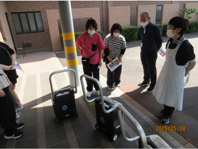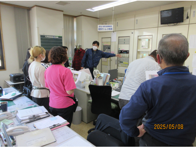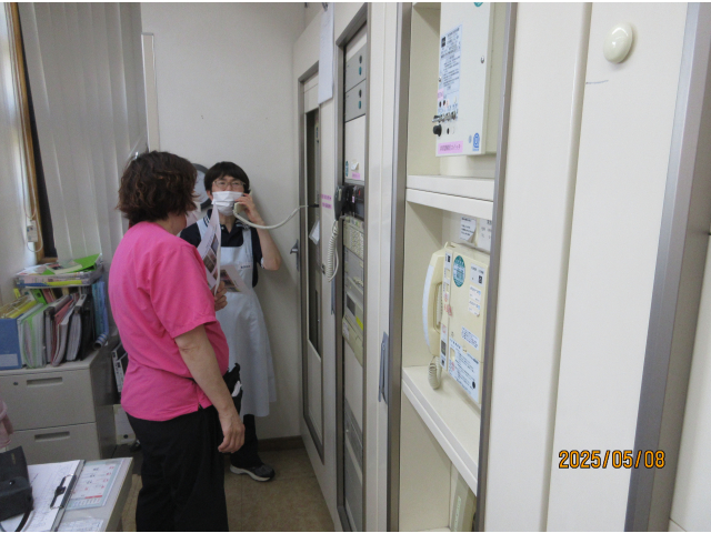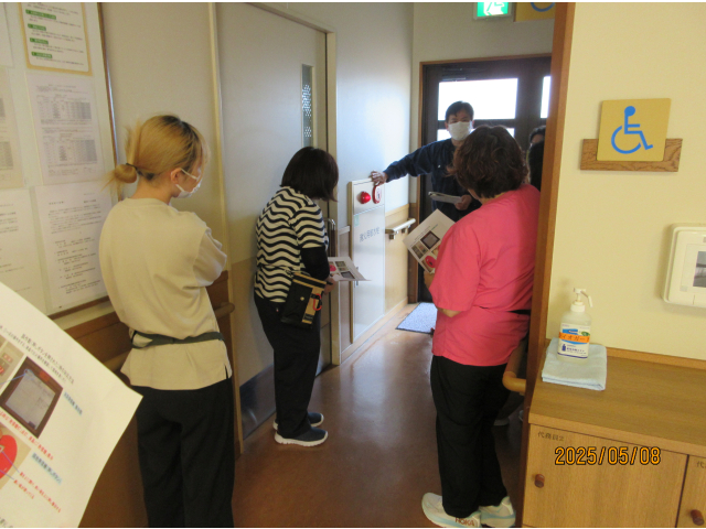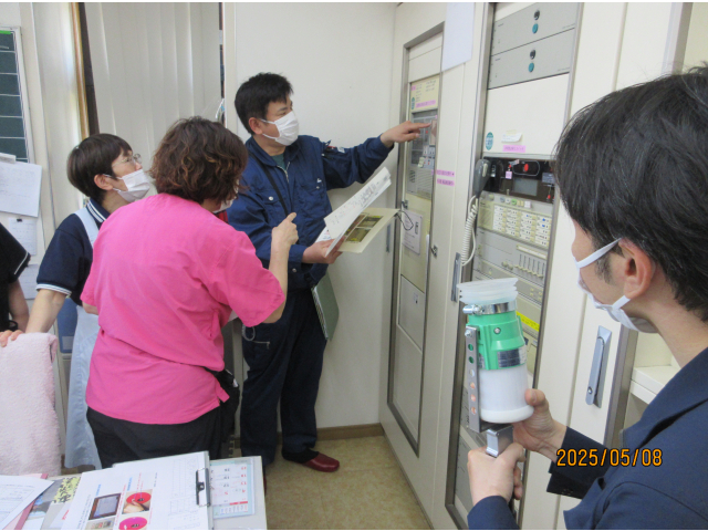 福祉施設には、普段あまり目にしない設備が意外と多くありますが、5月8日は主にこの春から小牧苑の仲間になった皆さんを対象に、各種防災機器の取り扱い訓練を行いました。